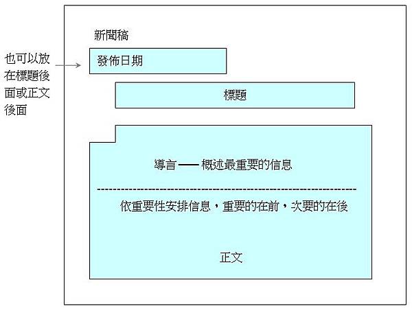不論是哪一種新聞稿,篇幅都不宜過長;正文部分應集中交代消息、活動等的重要信息。一般來說,正文最開頭的導語部分,往往概括了稿件最重要的信息,即新聞報道經常涉及的的所謂「六何」(何人、何事、何時、何地、為何、如何),然後依照信息的重要性,依次安排其他段落,形成「倒金字塔式」的結構: